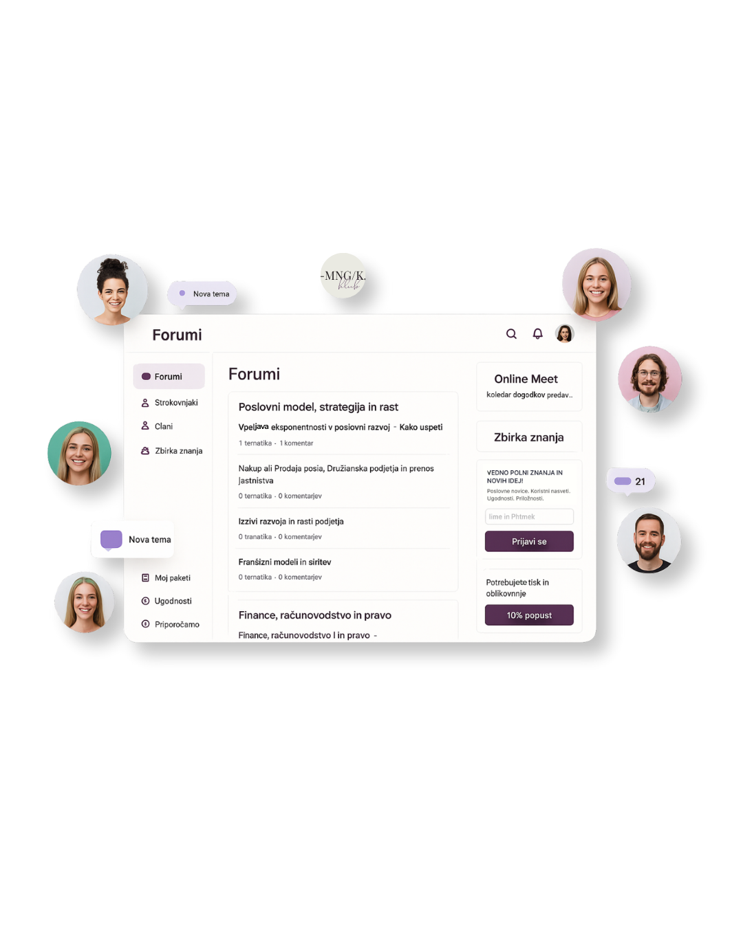 Klub Manager/ka je prostor, kjer podjetniki, ustvarjalci in strokovnjaki rastejo skupaj. Če šele razmišljaš o svojem poslu, če želiš hobi spremeniti v biznis, če si sam/a za vse in želiš narediti ekipo z razdeljenimi nalogami, pa to ne uspeva … Če želiš posel nadgraditi, prodati in iti dalje… Če iščeš načine do novih kupcev, če plačuješ oglase pa posla kar ni, če izgubljaš ure in ure s prelaganjem papirjev ali brskanjem po spletu…